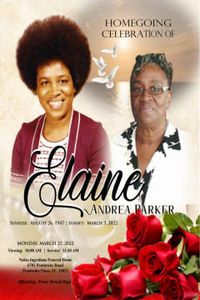 In Loving Memory of Elaine Parker Celebration of Life Services are as follows: Viewing- Monday March 21- 10:00 - 11:30 AM Service -Monday March 21- 11:30 AM At the Funeral Home Chapel. 6701 Pembroke Road Pembroke Pines, FL 33023
